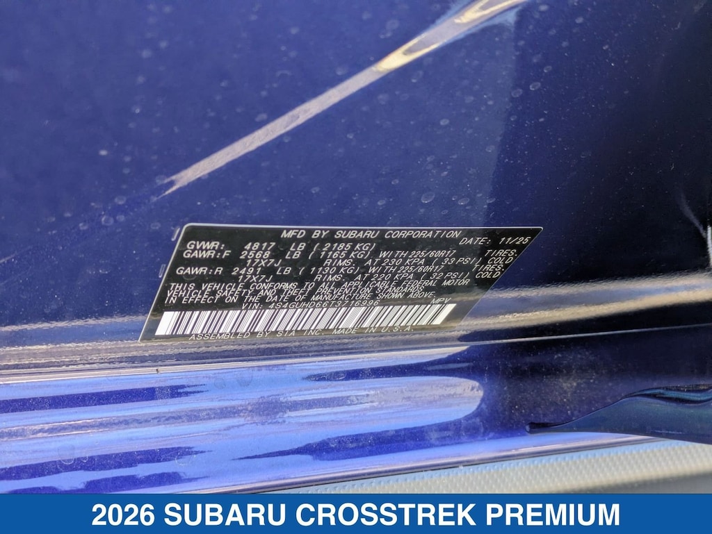 Sapphire Blue Pearl 2026 Subaru Crosstrek Premium AWD Lineartronic CVT 2.5L 4-Cylinder DOHC 16V Crosstrek Premium, 4D Sport Utility, 2.5L 4-Cylinder DOHC 16V, Lineartronic CVT, AWD, Sapphire Blue Pearl, Black Cloth.